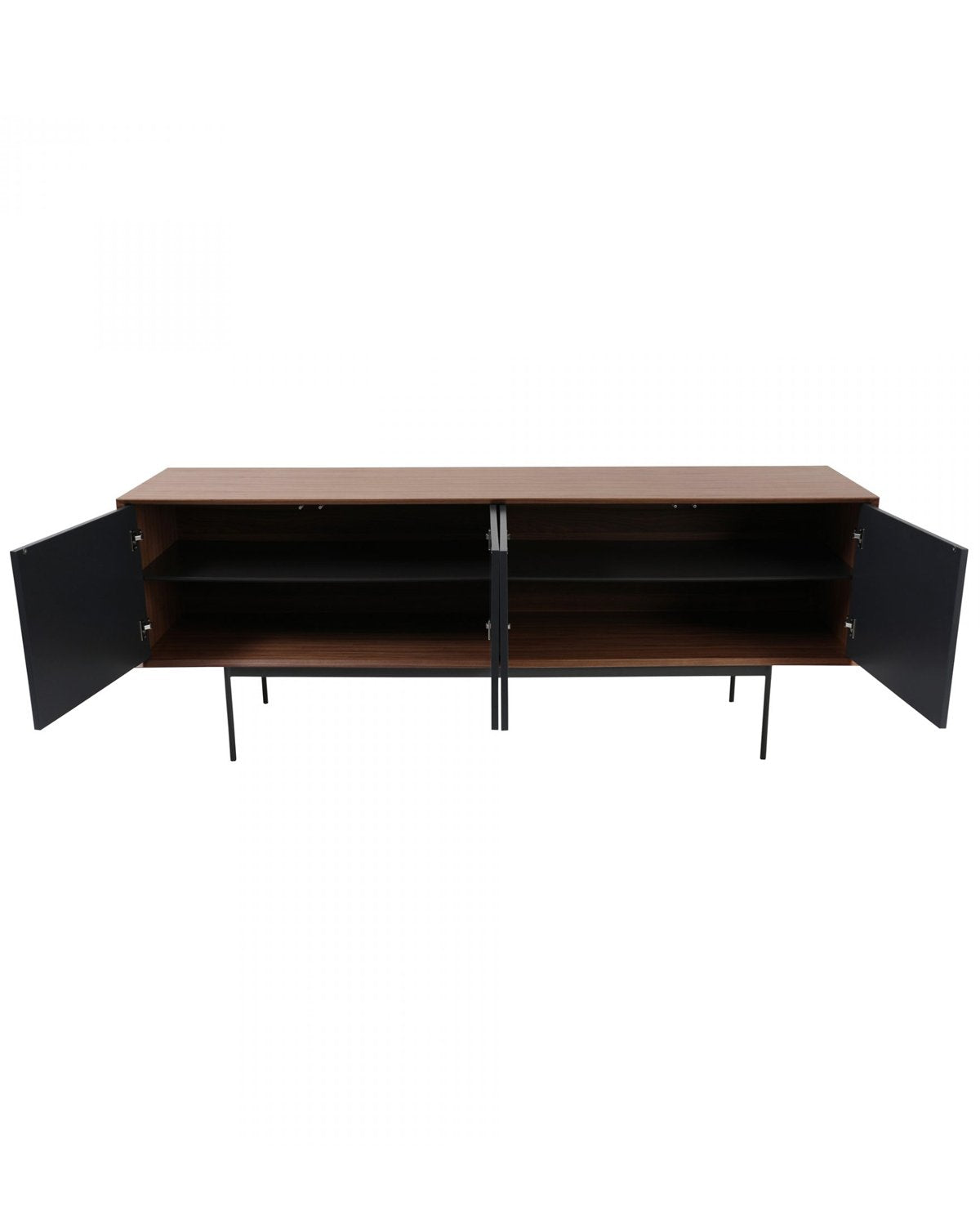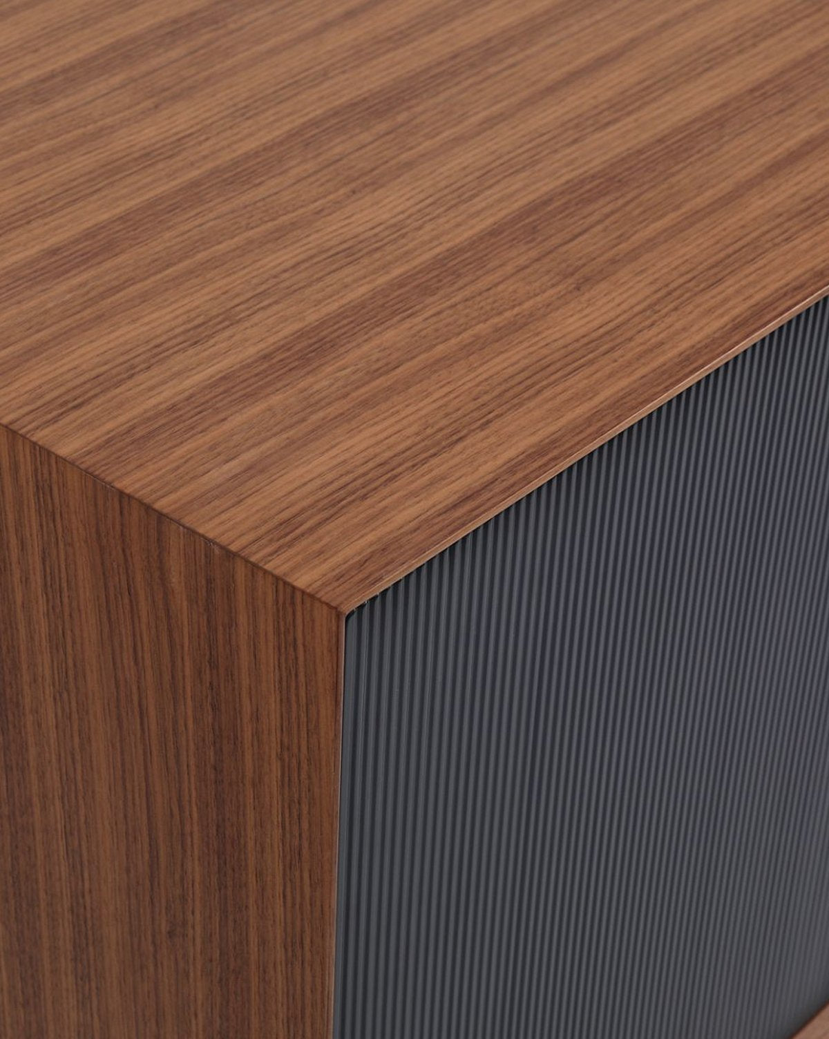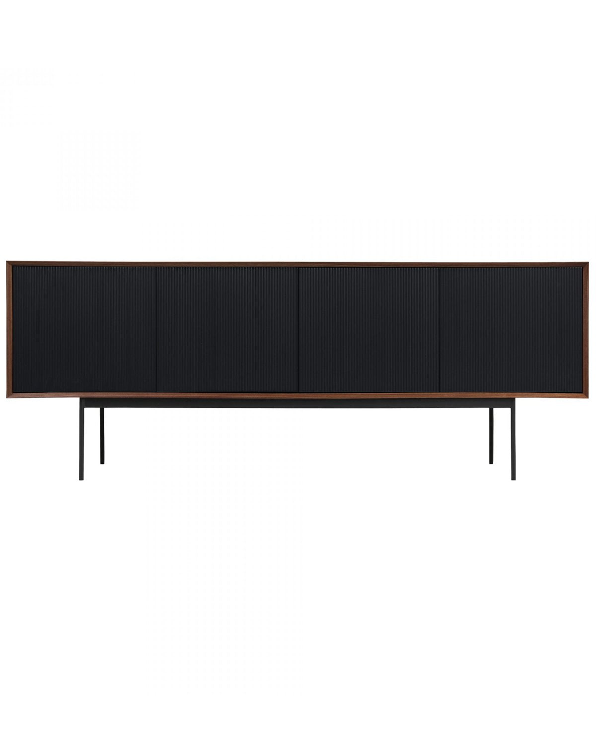 The Andrew Sideboard is mid-century modern at its finest. Set on a metal base with dark stained walnut veneer, its most interesting detail is the black corduroy wood fronts. Not only stylish but functional, its doors open up to four large shelves to fulfill every storage need.