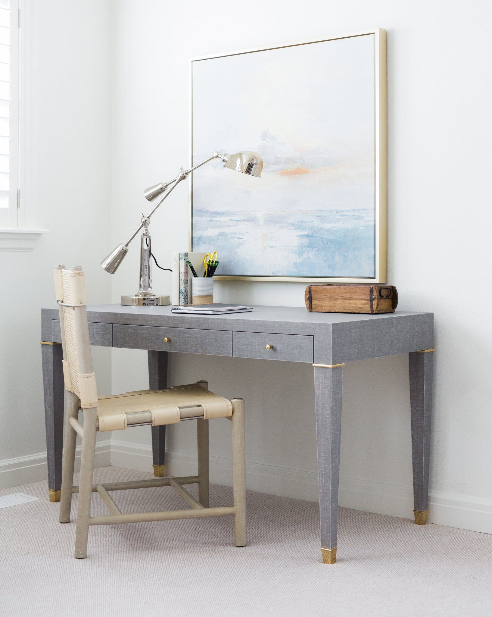 Linen wrapped, and then sanded down and sealed, this process creates a completely novel look that is perfectly complemented with its solid-brass hardware.