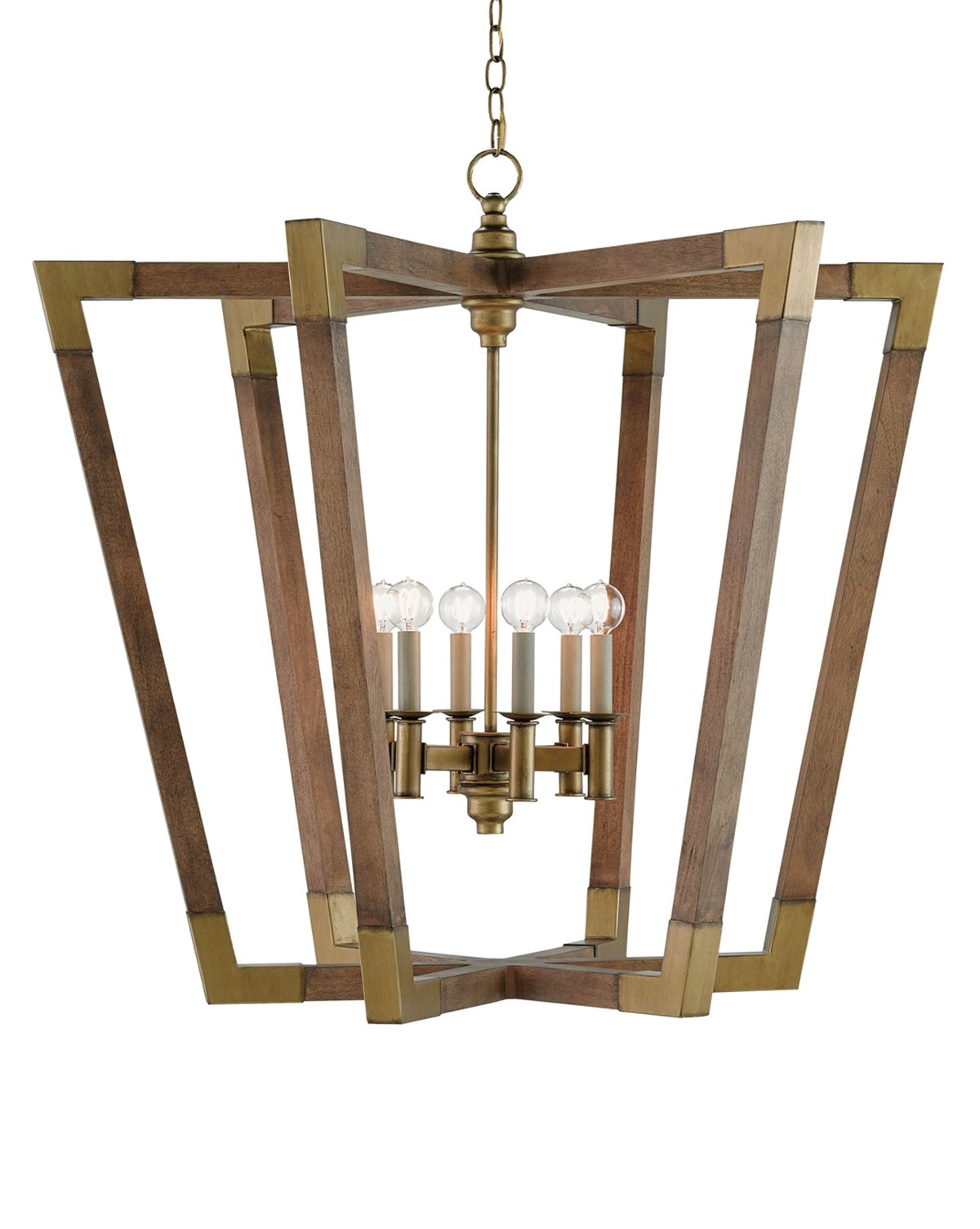 The Bastian Chandelier brings modern form to traditional cage lighting. Its interesting form is made with chestnut and brass corners, set to highlight the three-light fixture it houses.