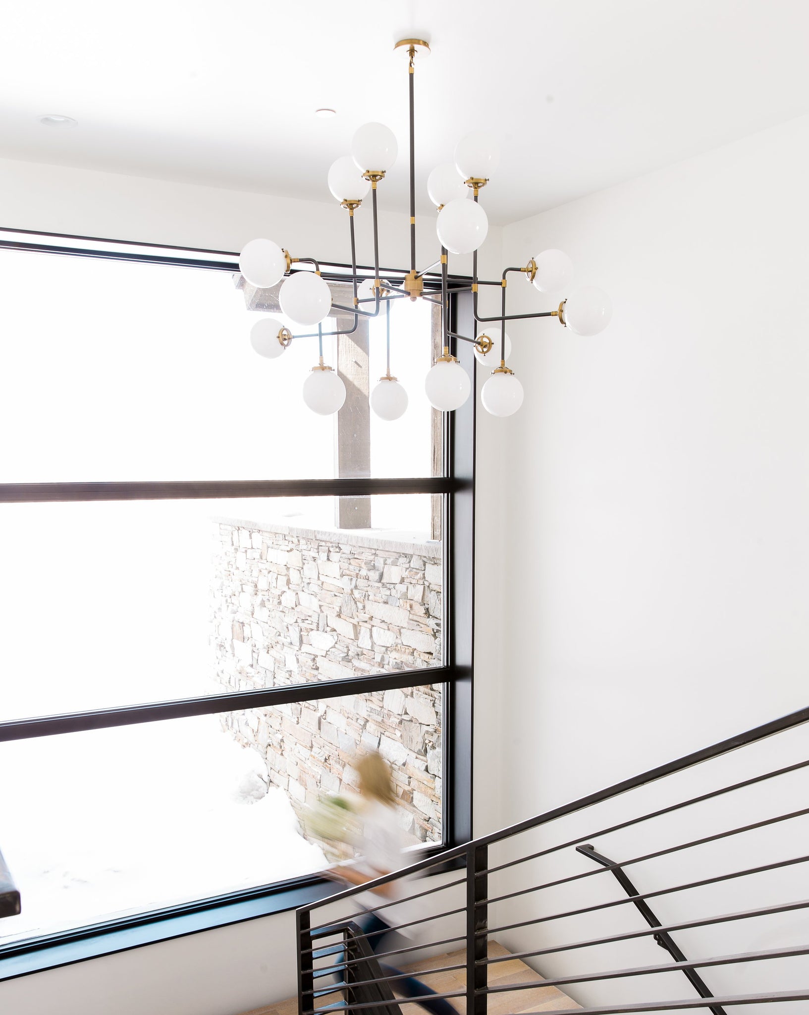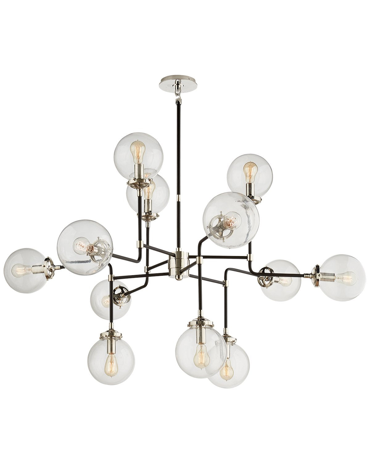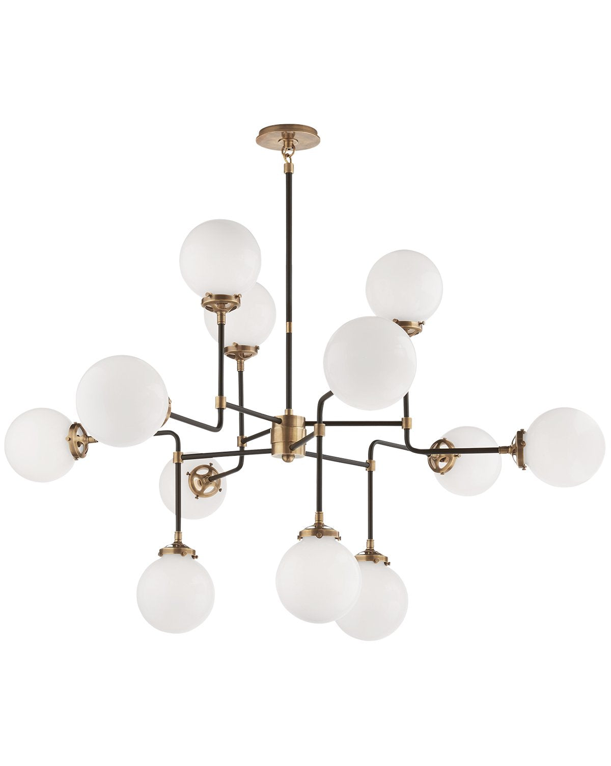 The mid-century modern feel that this bistro light gives off will really make a statement in your home. Each of its hand-rubbed antique brass and black strong arms has a white glass globe that will brighten your room.