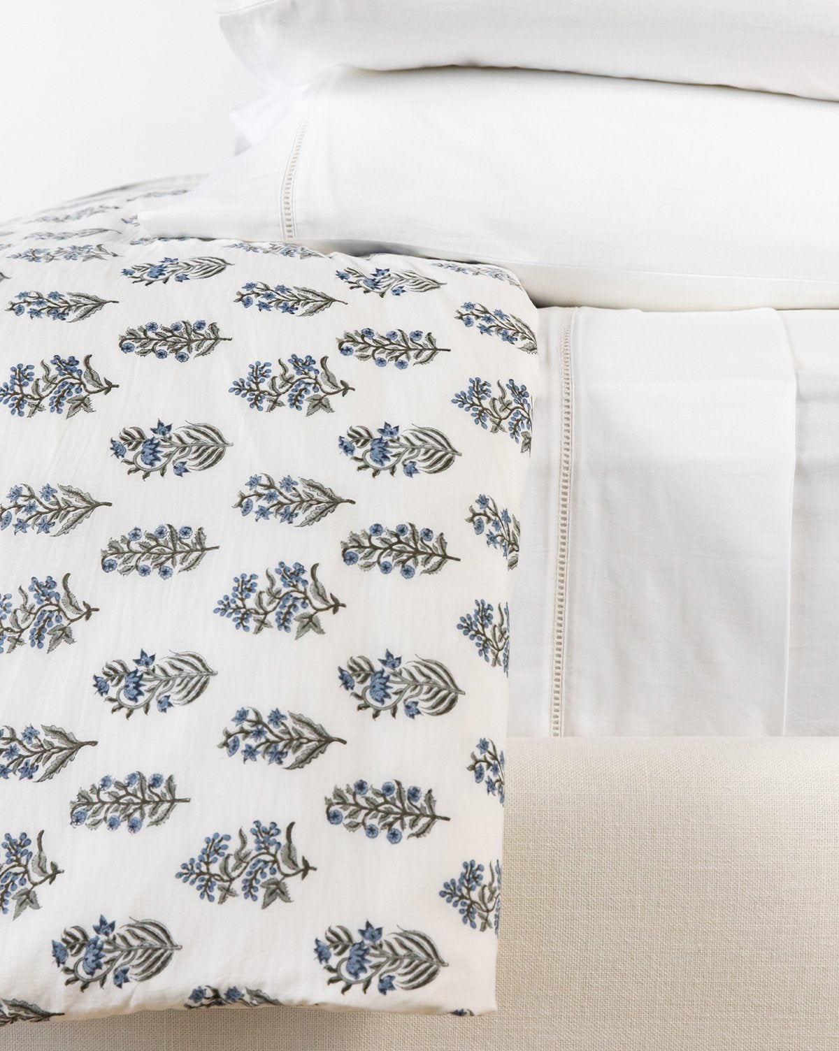 Crafted through timeworn tradition, the Blue Bell Floral Duvet Cover is constructed from Khadi cotton which is first woven by hand, then printed with true hand-engraved, block-print technique. Tones of blue and green play out a whimsical pattern on a simple white background, adding the perfect touch of color to your bedroom design.