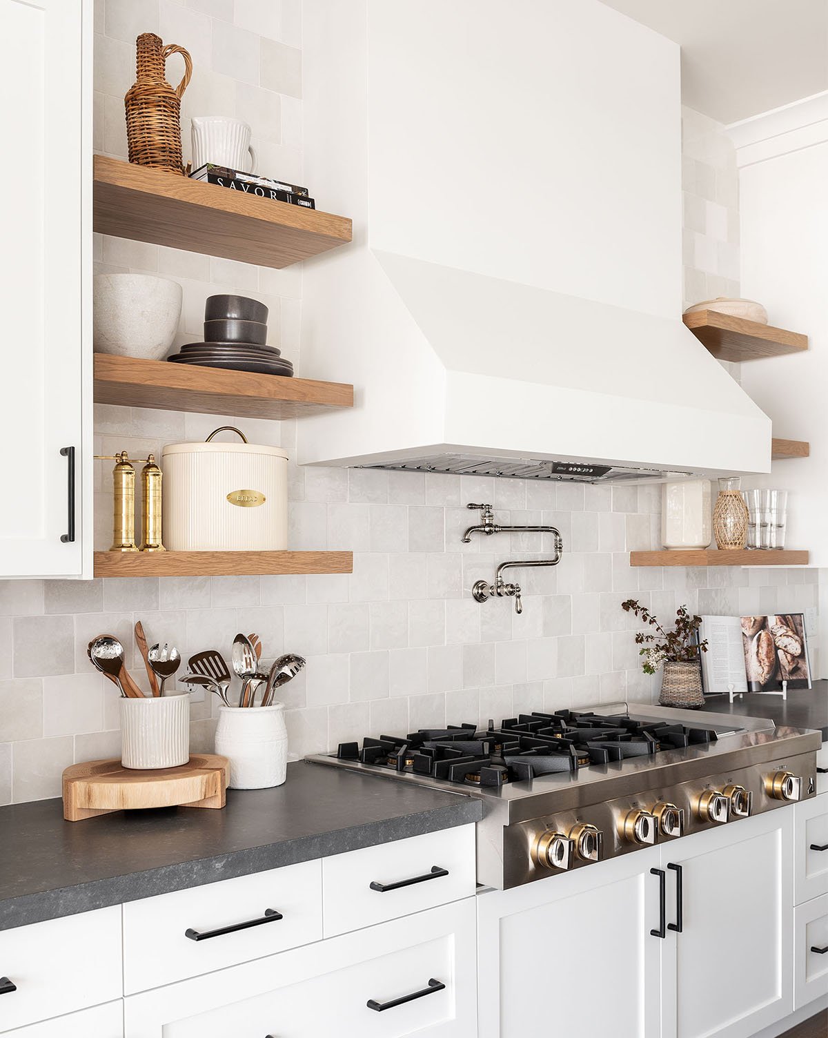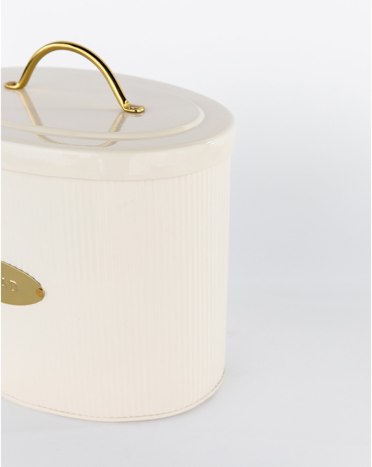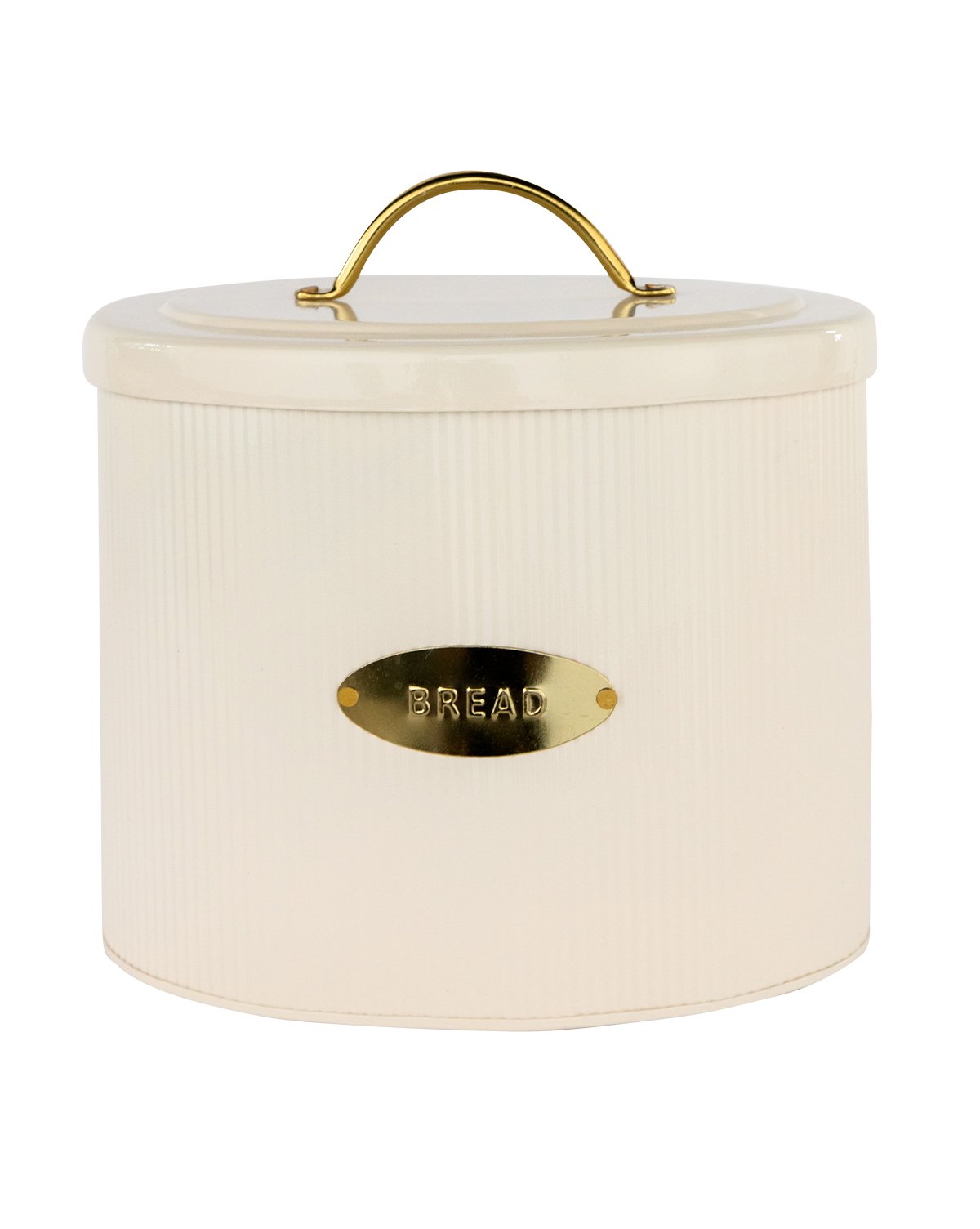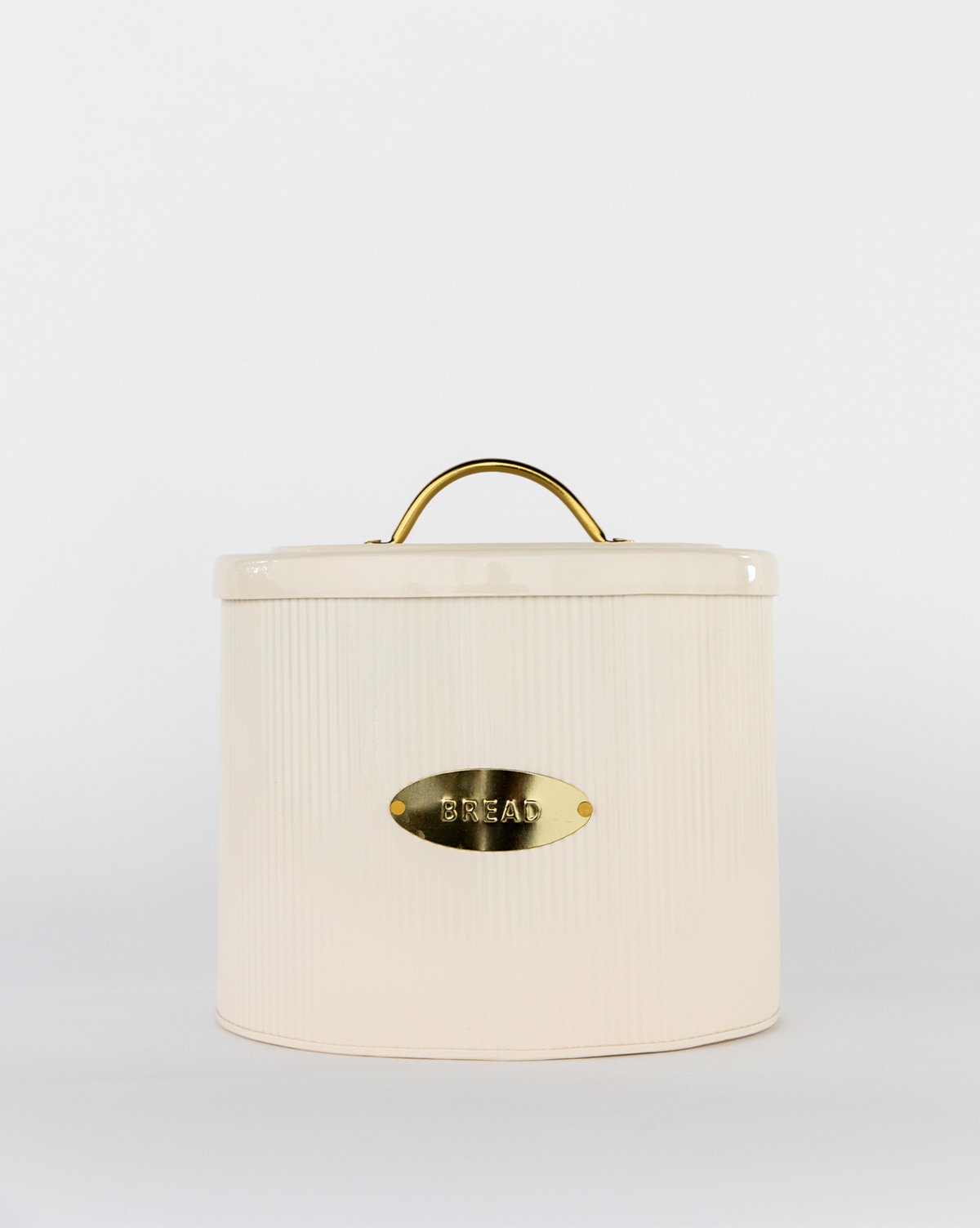 Keep your bread fresh with our Brass Detailed Metal Bread Box. An oval shape and slight ribbed detail give a delicate touch to its metal form. Finished with an oval brass “BREAD” stamp, and matching brass handle, this box looks just as good styled in your open shelving as it does filled with your favorite breads.